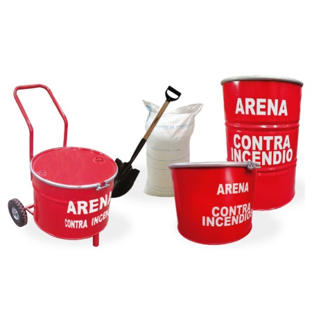 Seminuevo pintado en rojo con leyenda “Arena contra Incendio”, disponible con y sin llantas, capacidad 100 y 200 kg